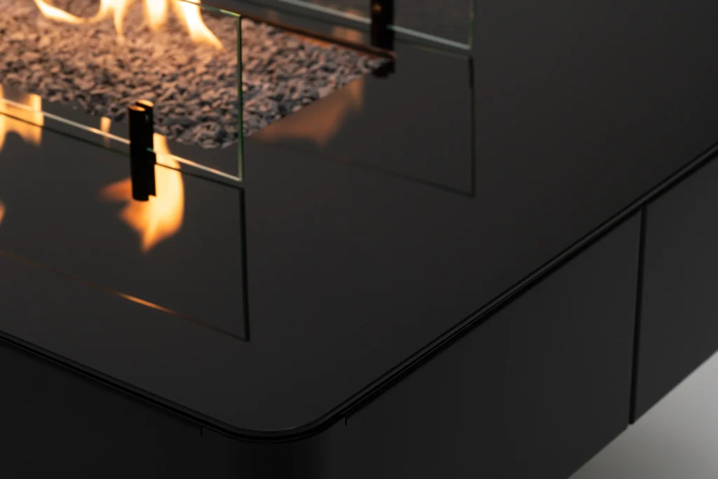 The linear fireplace of the rio table is surrounded on both sides by elegant glass panels, lending it an enchanting charm. Inside the fireplace, decorative stones create beautiful flames that add a romantic ambiance. It’s the perfect spot for evening coffee gatherings or a glass of wine.Thanks to its simplicity, you can enjoy the magical atmosphere in your garden just a moment after receiving the order! Moreover, you can be sure that you are ordering high-quality goods directly from a european manufacturer