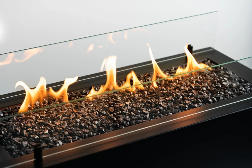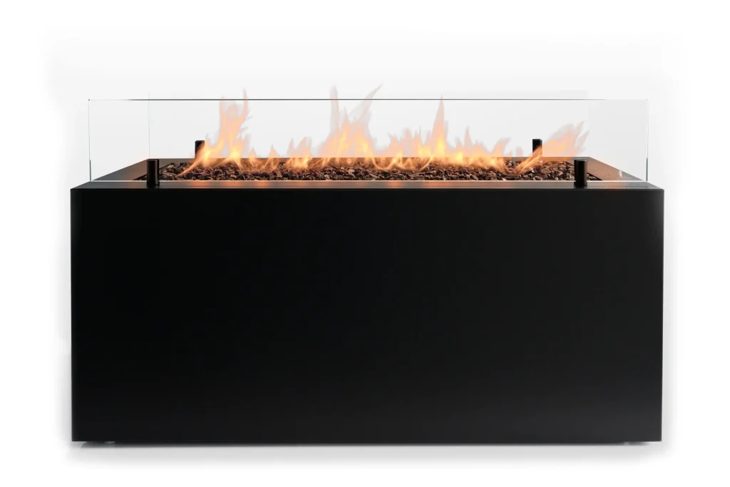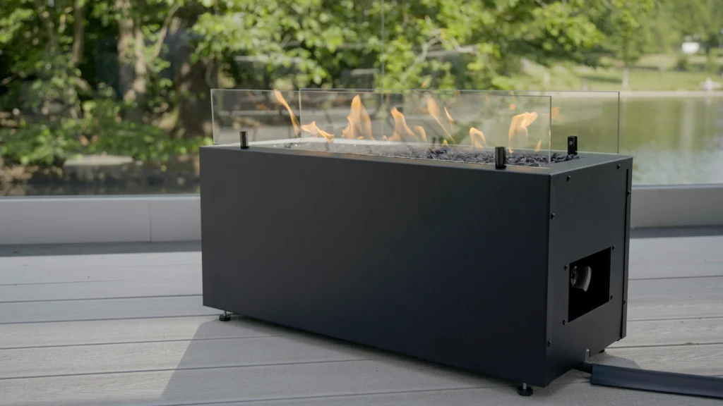 Rio gas fireplace is intended to be used outside, so naturally it has to be additionally protected against the weather. Compact, rectangular enclosure is made of steel and powder coated in black, to blend in into any surrounding. This type of finish immensely increases the resistance to the elements. To fight stronger drafts and wind Rio has two tempered glass screens on both sides of the flame.