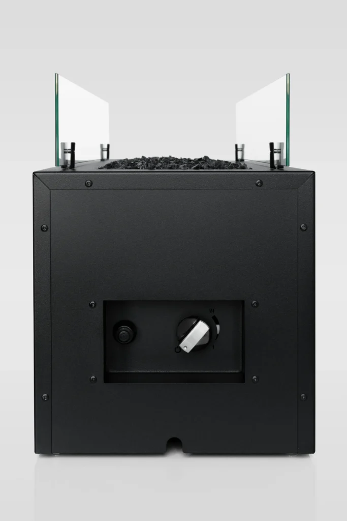 Rio is a black powder coat finish fireplace made of durable high quality materials, resistant to weather conditions. Enjoy the real golden flames up to 55 hours with this gas powered fireplace. Its small and compact size along with portable solution allows you to place it wherever you want on your terrace or around your garden. See-through glass panel stabilizes the fire and black glass gravels make an attractive addition.